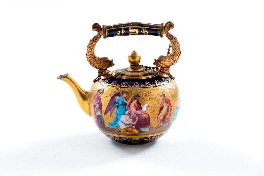 en porcelaine émaillée polychrome. La panse est ornée d'une scène à l'antique figurant des philosophes disposés en frise. De part et d'autre, deux fines frises de palmettes et d'arabesques encadrent la scène et se détachent sur un fond bleu nuit. La anse est ornée de deux dauphins affrontés en métal doré. Le couvercle est retenu par une chaîne perlée.