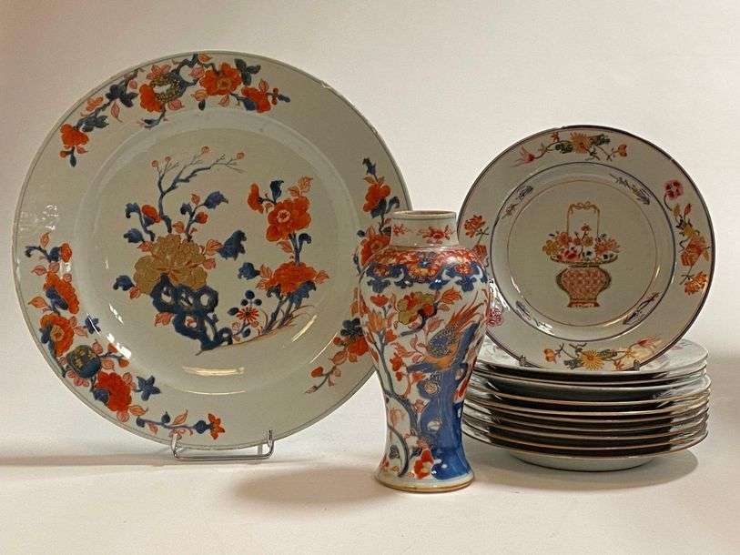Ensemble de 11 assiettes et un plat circulaire à décor imari, de blanches florales.