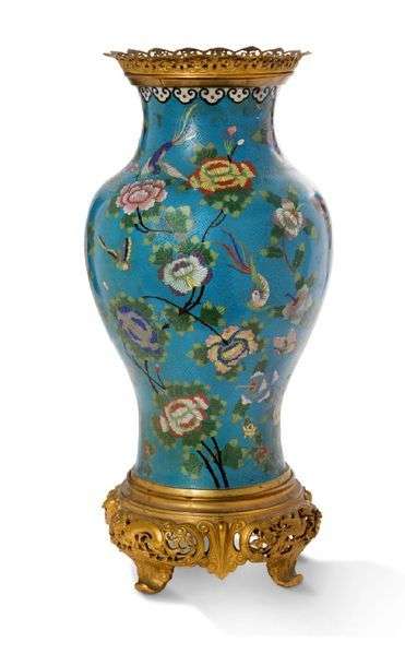 Vase balustre en bronze et émaux cloisonnés à décor polychrome sur fond bleu d'hirondelles et papillons évoluant parmi les fleurs.