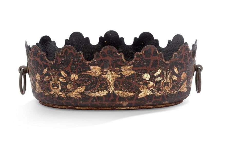 Verrière d'époque Louis XVI en tôle peinte, à fond noir, à décor de trophé