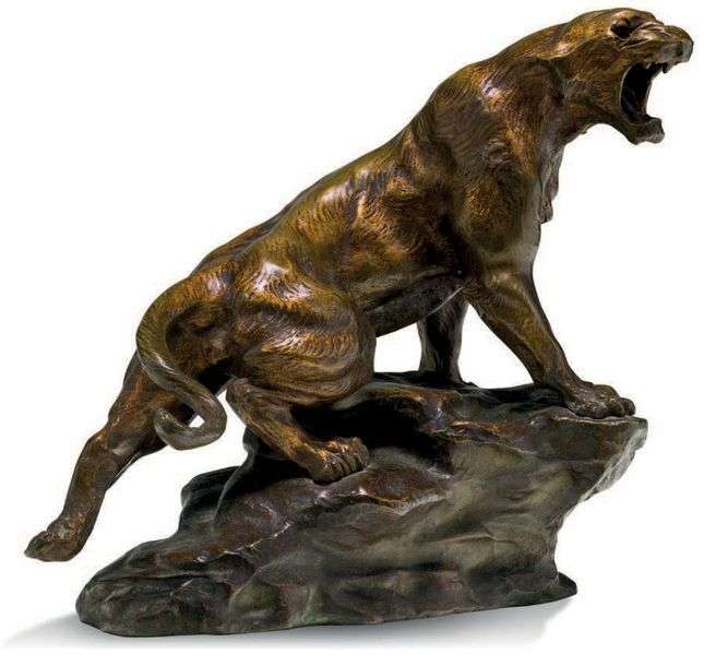 Bronze à patine brune, signé sur la terrasse formant rocher.