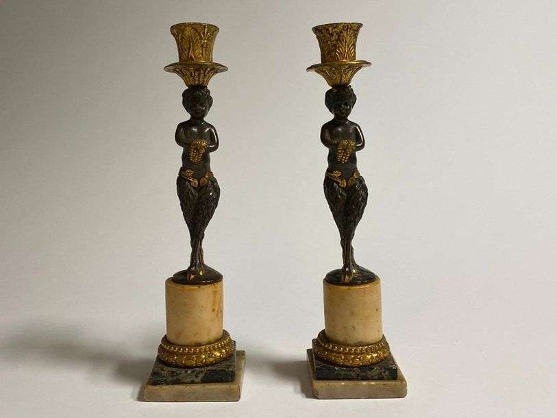 On y joint une paire de flambeaux en bronze doré et patiné, le fût à décor de satyres enfants retenant une grappe de raisins, reposant sur une colonne en mabre blanc ceinte d'une frise de perles et feuillagée.