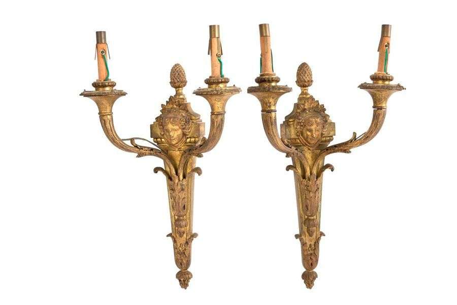 Paire d'appliques en bronze anciennement doré et ciselé de style Louis XVI à deux bras de lumières à décor d'un masque de femme couronnée de pampres de vigne. La platine à décor feuillagé d'acanthes est sommée d'une pomme de pin.