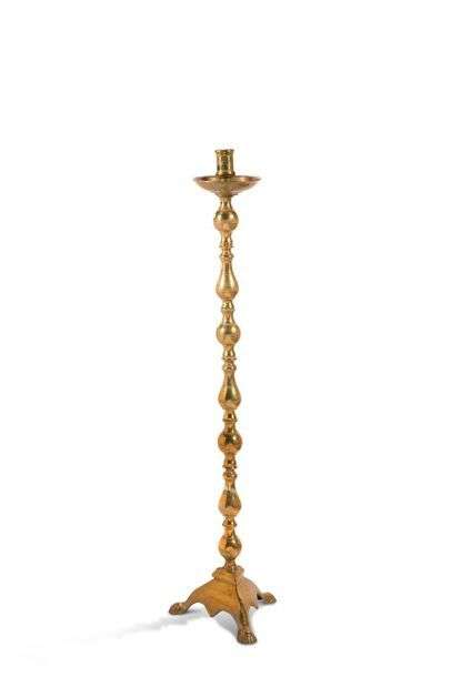 Paire de hauts piques-cierges tripode en laiton montés en lampadaire, piètement en pattes de lion.