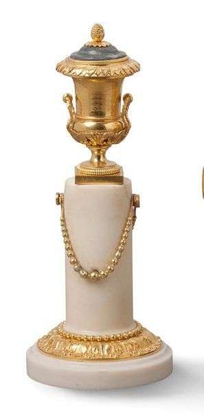PAIRE DE CASSOLETTES en marbre blanc gris et bronze ciselé doré formés de vases Médicis. La frétel en forme de grappe repose sur un fût tronconique à base circulaire orné d'une frise feuille d'eau.