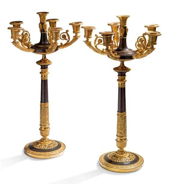 PAIRE DE GRANDS CANDÉLABRES en bronze ciselé, patiné et doré, à six bras de lumières en volutes de palmettes, le bras central rythmé de mascarons égyptiens. Le fût évasé terminé en patte de lion et la base circulaire à frises de feuillages grainés et décor rayonnant de palmettes stylisées.