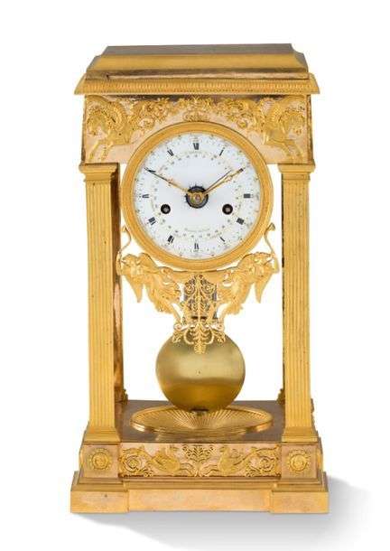 RÉGULATEUR DE CHEMINÉE en bronze doré, mat et brillant à quatre pilastres d'angle cannelés. Elle est ornée de chevaux marins et griffons ailés, Renommées, palmettes et rinceaux. Cadran d'émail signé Manière à Paris. Mouvement à complications, à trotteuse, jours, quanties et mois. Balancier à couteau à grill et compensation.