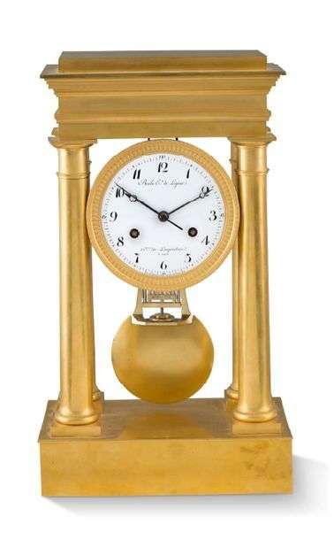 PENDULE PORTIQUE À QUATRE COLONNES en bronze doré mât et brillant. Cadran d'émail à chiffres arabes, signé «Boulu, élève de Lépine, Horloger de l'Impératrice à Paris, rue du Roule, près celle, Betizy n° 4 ».