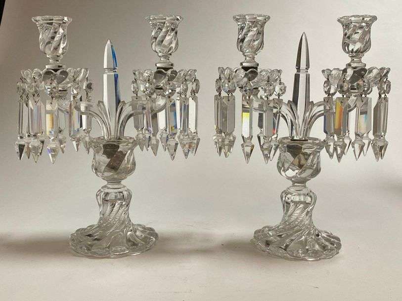 Paire de candélabres de modèle bambou à deux bras de lumière en cristal moulé et pampilles, le piétement à cotes de torses