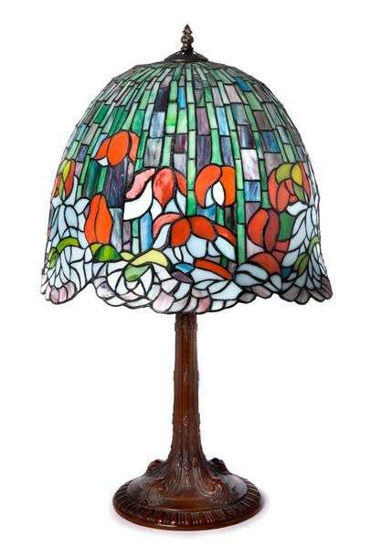 Lampe à abat-jour à decor en vitraux cerclés de plomb à decor floral.