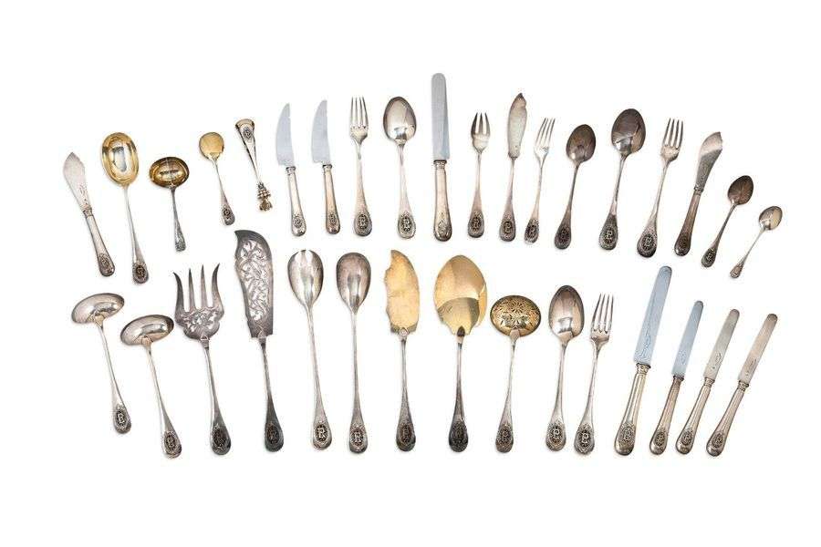 Partie de ménagère en argent uni à spatule ajourée d'un monogramme «PL» comprenant : Dix-huit couverts à entremet (92 gr ) Dix-huit couverts (147 gr) et huit fourchettes (74 gr) supplémentaires Dix-huit couteaux manche inox (76 gr) Vingt-six couteaux à entremet (40 gr) Un couvert de service à poisson en argent ajouré (245 gr) Un couvert à salade (185 gr) Une saupoudreuse (74 gr) Une pince à sucre (53 gr) Deux cuillers à sauce (145 gr) Une cuiller de service à glace (113 gr) Un couteau de service à poisson (125 gr) Une cuiller à oeuf (18 gr) Deux couteaux à fromage (90 gr) Un couteau à fromage (54 gr), lame en argent BOYER CALLOT, poinçon Minerve Poinçon Minerve