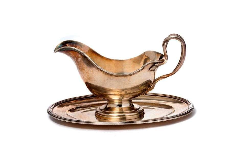 Saucière en argent uni (950), la anse à décor de deux branches feuillagées entrelacées, la soucoupe solidaire à filets et monogramme P,