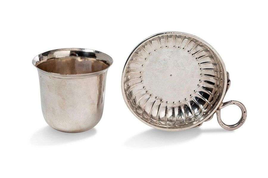 Ensemble comprenant un tastevin godronné à anse de serpent monogrammé R Faussillon et une timbale à filets en argent.
