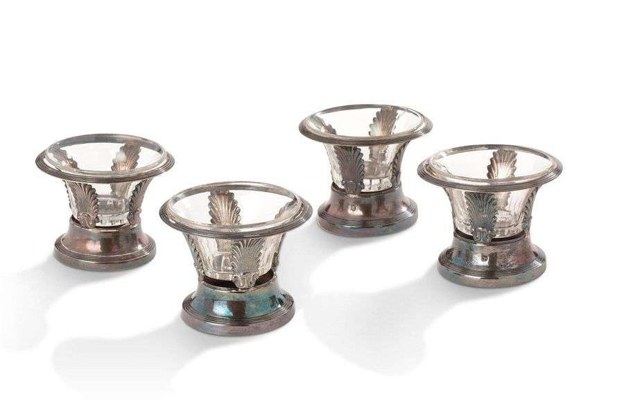 Ensemble de quatre salerons à monture ajourée en argent (950) à décor repoussé de palmettes. Fond de verre incolore de forme évasée