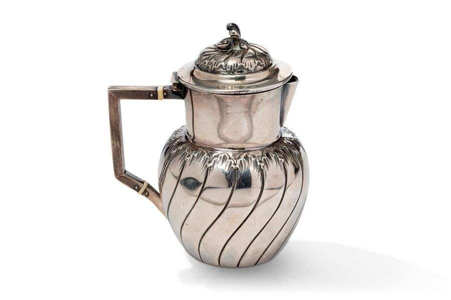 Petite verseuse à panse bombée et décor torsadé. Anse baguée d'ivoire, couvercle à prise feuillagée.