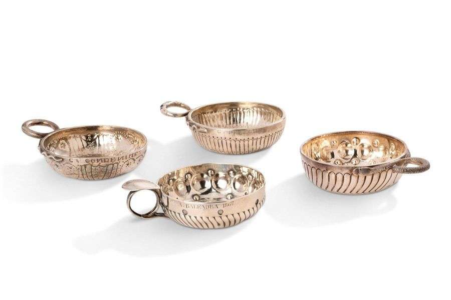 Réunion de quatre tastevins en argent, trois à anses de serpents et décors