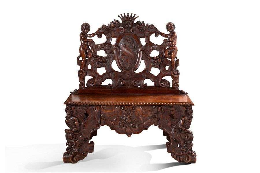Banquette en bois mouluré sculpté, aux coins formés d'hommes aux corps de lions ailés.
