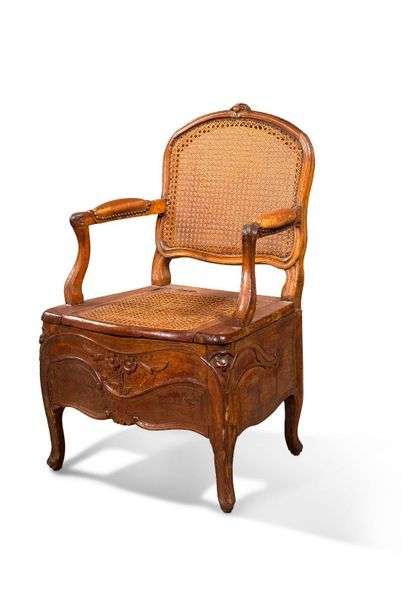 Fauteuil de commodité en hêtre mouluré sculpté de fleurettes sur la ceinture et la traverse supérieure du dossier. Accotoirs à manchette en cuir, dossier et assise cannées. Pieds terminés en enroulement.