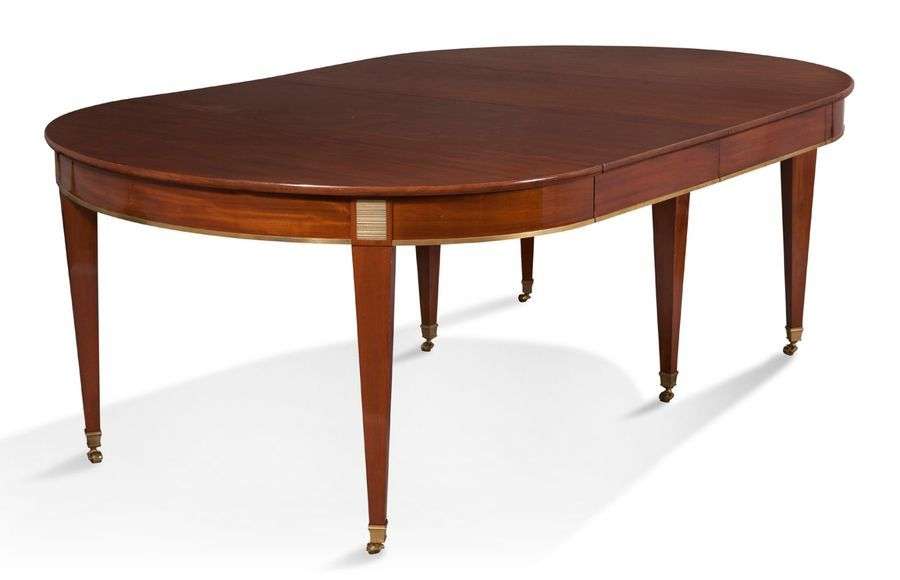 GRANDE TABLE OVALE en acajou et placage d'acajou reposant sur quatre pieds gaine à sabots de laiton. La ceinture est ornée de grattoirs.