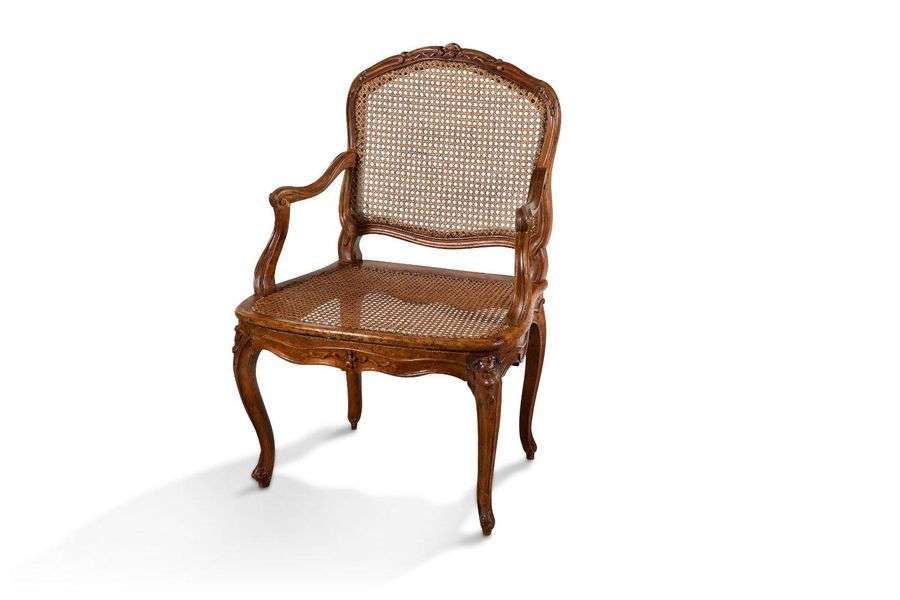 Fauteuil à dossier plat et assise large en noyer mouluré et sculpté de fleurettes, fond de canne. Les accotoirs et consoles d'accotoirs sont de forme mouvementée. Pieds cambrés