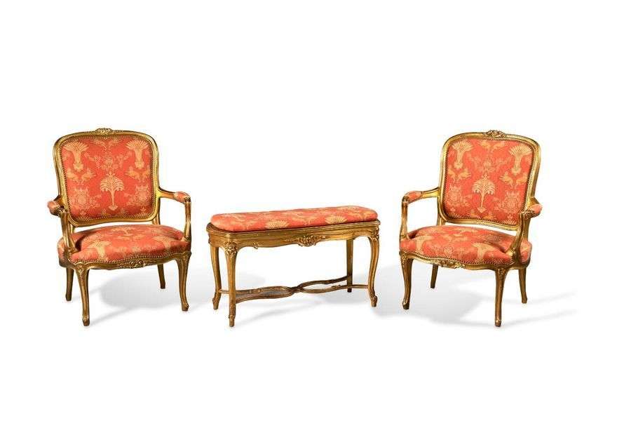 Mobilier de salon de style Louis XV en bois sculpté et doré comprenant un
