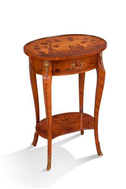 Petite table de salon à plateau de forme ovale. Placage de satiné et