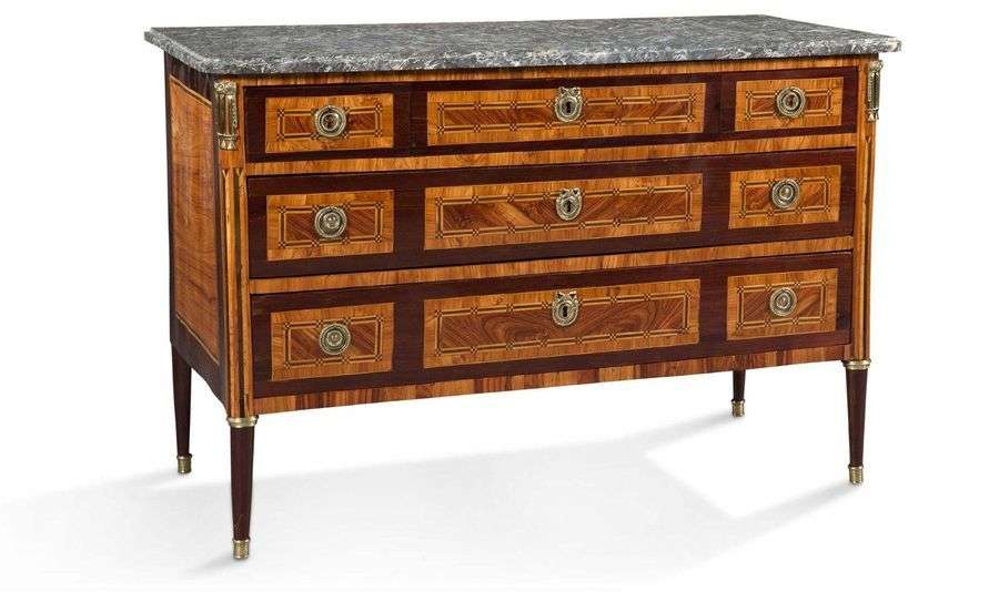 COMMODE en marqueteries de bois variés à décor géométrique. Bâti de chêne, placage de bois de rose, satiné, amarante, bois verdi. Elle ouvre en façade par cinq tiroirs sur trois rangs. Ses montants arrondis sont à décor de colonnes feintes et reposent sur quatre pieds fuselés terminés par des sabots de bronze uni. Fin de l'époque Louis XVI. Porte une estampille Dusautoy et marque JME.