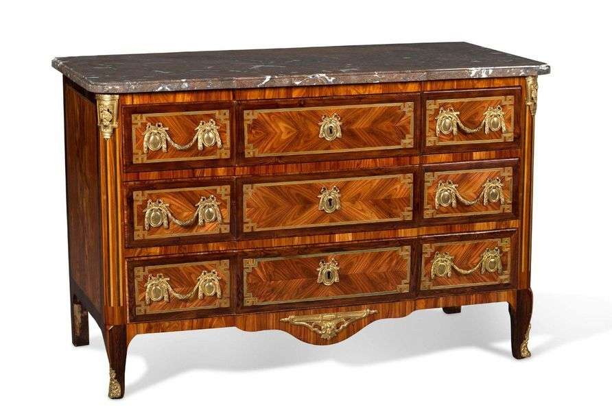 COMMODE en placage de bois de rose en ailes de papillon et filets de bois verdi, bâti de chêne. Elle ouvre en façade par cinq tiroirs sur trois rangées ornés aux angles de grecques. Les montants arrondis à cannelures feintes reposent sur des pieds cambrés. Ornementation de bronze ciselé doré telle que : chutes, entrée de serrure, poignées de tirage, culot et sabots. Epoque Transition Plateau de marbre rose veiné gris mouluré