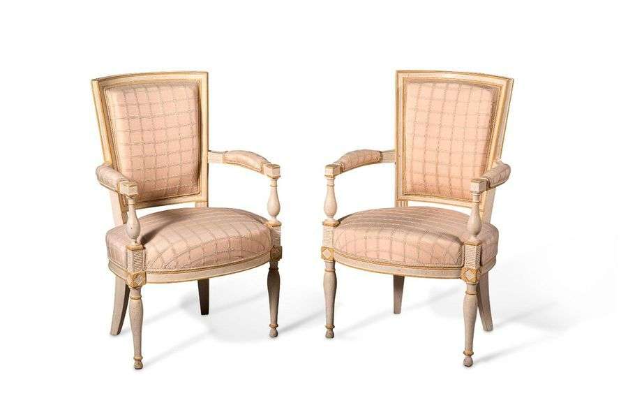 Paire de fauteuils à dossier rectangulaire en bois mouluré et sculpté relaqué crème. Accotoirs à manchette, consoles d'accotoirs de forme balustre. Dé de raccordement losangé. Pieds antérieurs balustre et pieds postérieurs sabres.