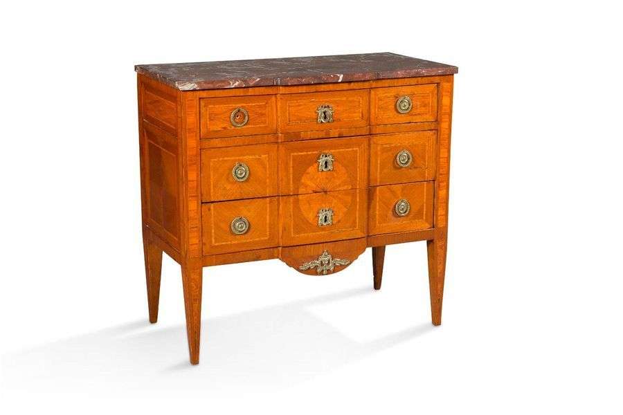 Commode en placage de satiné ouvrant en façade par trois tiroirs sur trois rangs. Ornementation de bronzes ciselés et dorés.