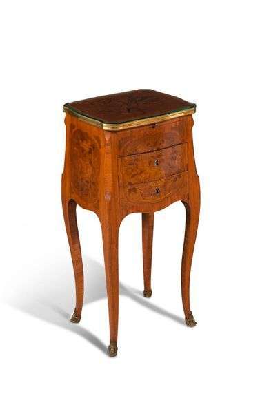Petite table écritoire à façade et cotés galbés, ouvrant en façade à deux tiroirs et une tablette formant écritoire et un tiroir latéral. Reposant sur quatre pieds galbés.