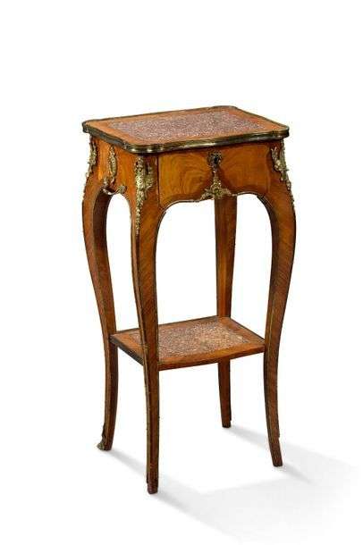 Petite table de chevet en marqueterie reposant sur des pieds sinueux réunie par une tablette d'entretoise. En ceinture, ornementation de bronze doré à décor floral et de coquilles écorchées.