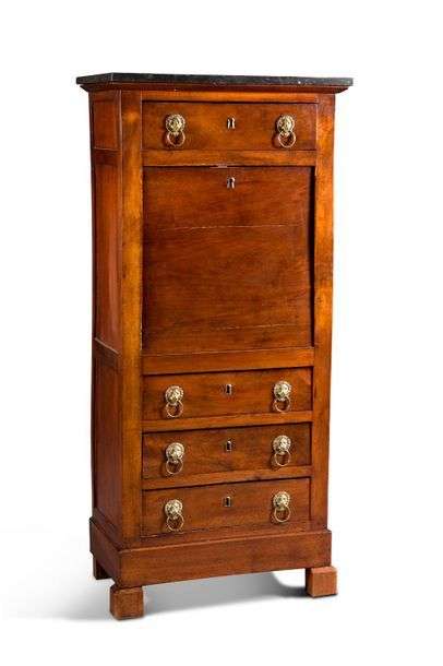 Petit secrétaire en noyer ouvrant à quatre tiroirs et un abattant. Poignées à têtes de lions soutenant des anneaux.