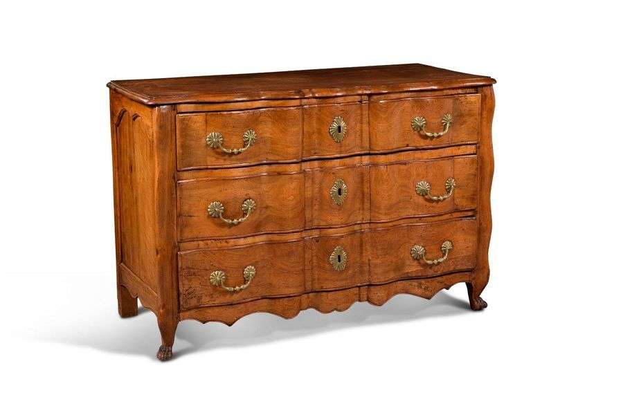 Commode en noyer à façade arbalète ouvrant à trois rangs de tiroirs, les montants ondés terminés par des pieds en pattes de lion. Ornementation de bronzes dorés à motifs rayonnants : entrées de serrure et poignées de tirage.