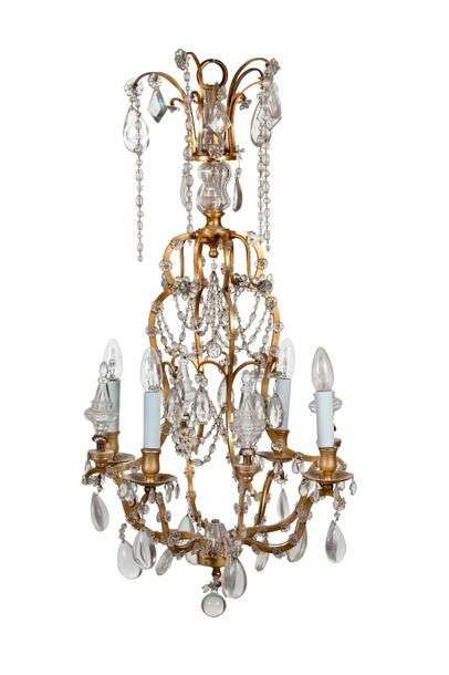 Lustre cage à quatre bras de lumière en bronze et cristal taillé. Gouttes,