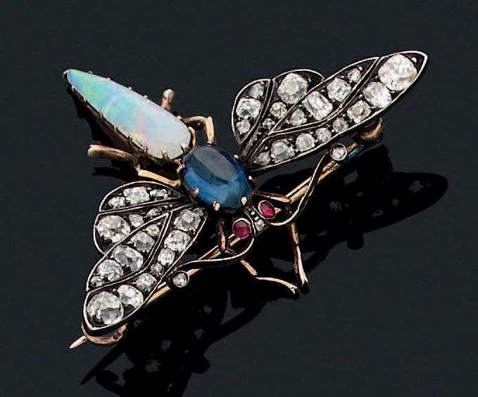 Opale, cabochon de saphir, diamants taille ancienne. Or 18K (750), argent (<800)