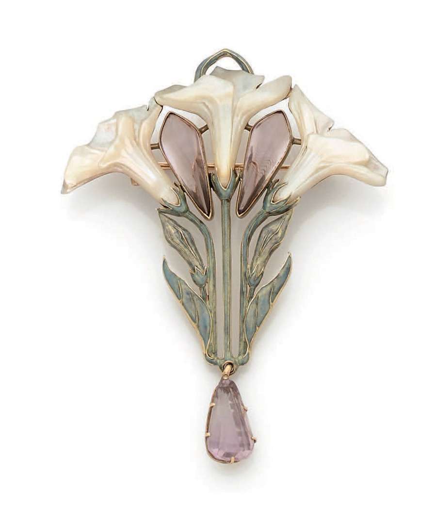 Cette envoûtante broche, sur laquelle se dressent trois fleurs de Datura, également nommée «herbe des magiciens», est un témoignage de la virtuosité technique et du certain symbolisme lapidaire que revêtent les créations de Lalique. En effet, l'artiste met la nacre au service de la douce couleur des améthystes et utilise un émail cloisonné vert opalescent afin de faciliter le passage de l'or à l'irisation des pierres fines.