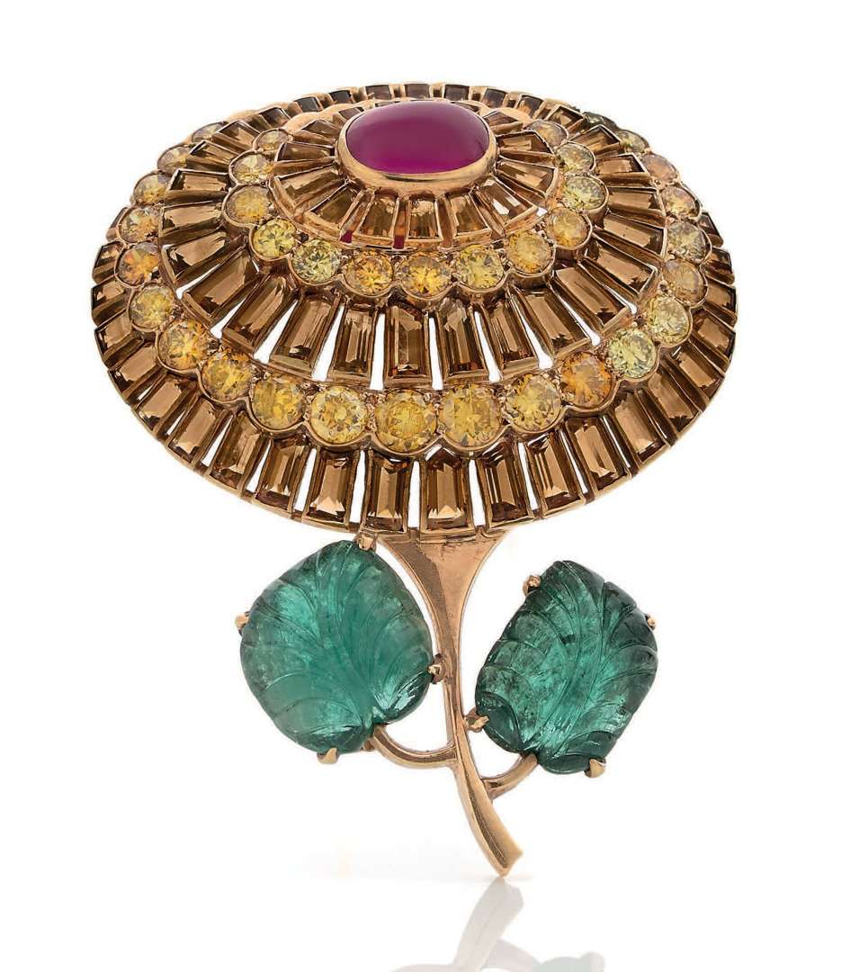 Une broche fleur issue d'un monde merveilleux composée de baguettes de citrines rayonnant autour d'un cabochon de rubis le tout rehaussé de «vivid intense yellow diamonds» allant du jaune citron au bouton d'or, en passant par le cognac ou le canari, la tige ponctuée d'émeraudes gravées.