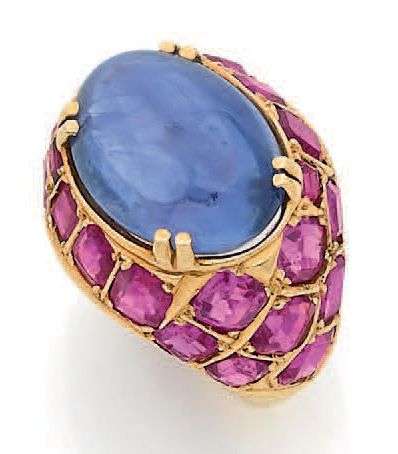 Bague «dôme» Saphir cabochon, pavage de rubis. Or jaune 18K (750). Poids du saphir : 19.15 carats selon extrait d'archives Belperron. Td. : 52 - Pb. : 14.7 gr. Accompagnée d'un certificat de Monsieur Olivier. Baroin attestant qu'il s'agit d'une création de Suzanne. Belperron commandée en octobre 1973 selon l'extrait d'archives.