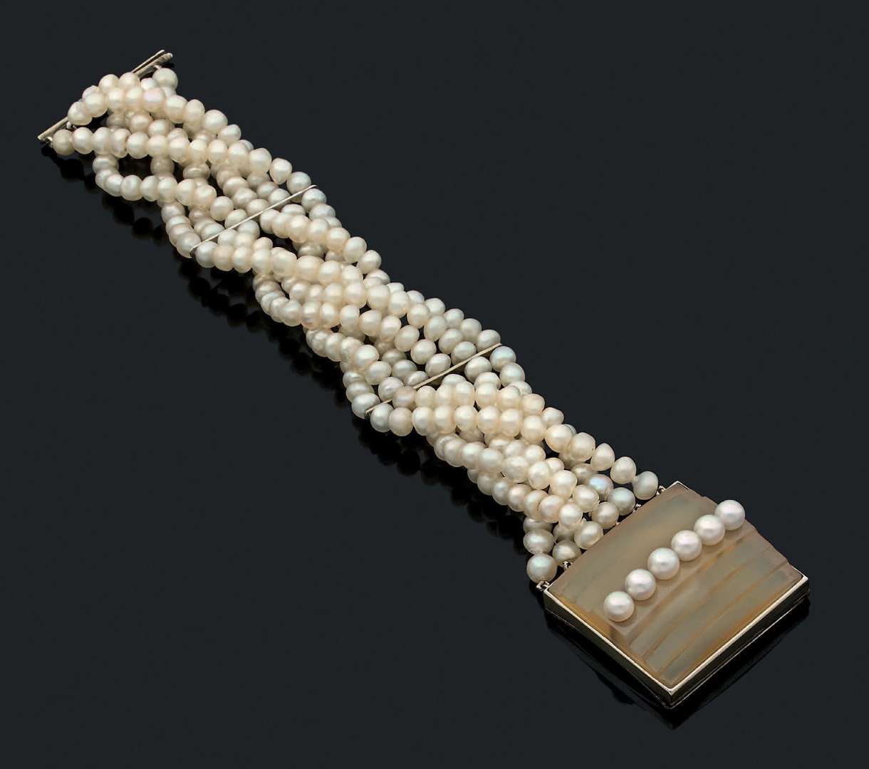 Bracelet «perles fines» Motif agate blonde à gradins et perles fines formant fermoir. Monture métal (alliage d'or). L.du bracelet : 17 cm env. Dim.fermoir : 2.75 x 2.6 cm env - Pb. : 38.7 gr. Accompagné d'un certificat de Monsieur Olivier. Baroin attestant qu'il s'agit d'une création de SuzanneBelperron postérieure à 1935.