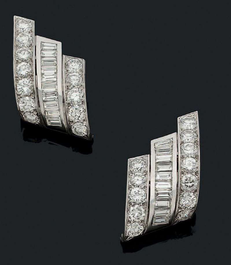 PAIRE DE CLIPS D'OREILLES Composés de trois lignes de diamants ronds, taille brillant et baguette