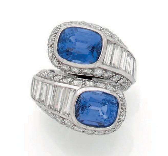 BAGUE «TOI ET MOI» Saphirs ovales, diamants baguettes et brillants. Or gris 18K (750). Td. : 49 - Pb. : 16.2 gr. Accompagnée de deux certificats LFG N°162183 / N°162184 (duplicata) attestant : Poids : 5.26 / 5.60 carats, Origine : Ceylan, Pas de modification thermique constatée