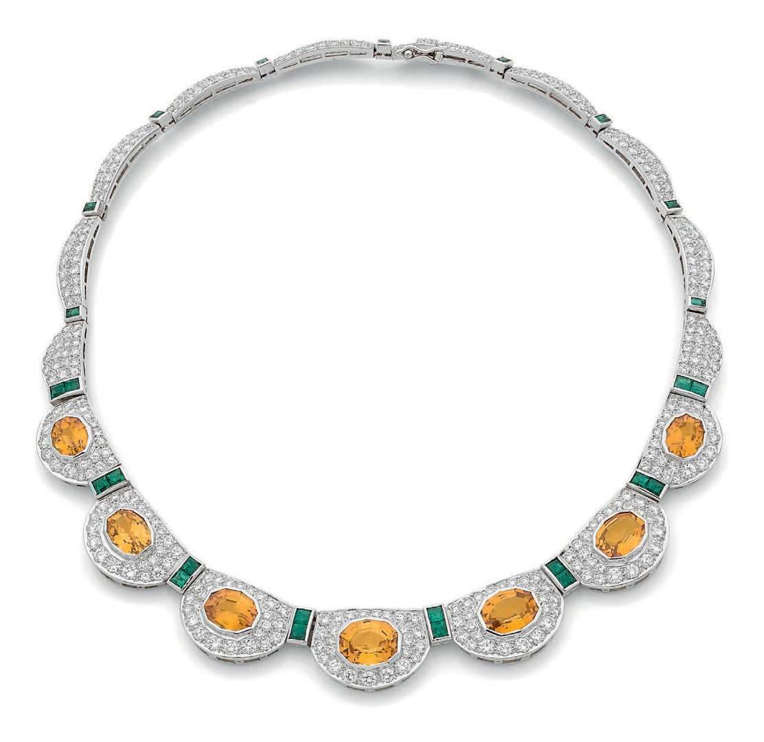 Parure collier et bracelet. Diamants ronds, saphirs jaunes et émeraudes calibrés. Or 18k (750). Signés et numérotés - Poinçon de maître. L. bracelet : 15.5 cm env. - Pb : 71 gr