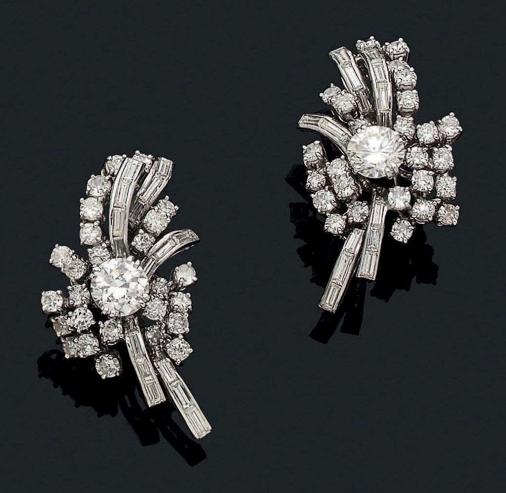 Paire de clips d'oreilles. Diamants ronds et baguettes. Platine (950), or gris 18K (750). Signée Monture Boucheron, écrin. Diamant central : 1.25 carat env. L. : 3.5 cm env. - Pb. : 23 gr
