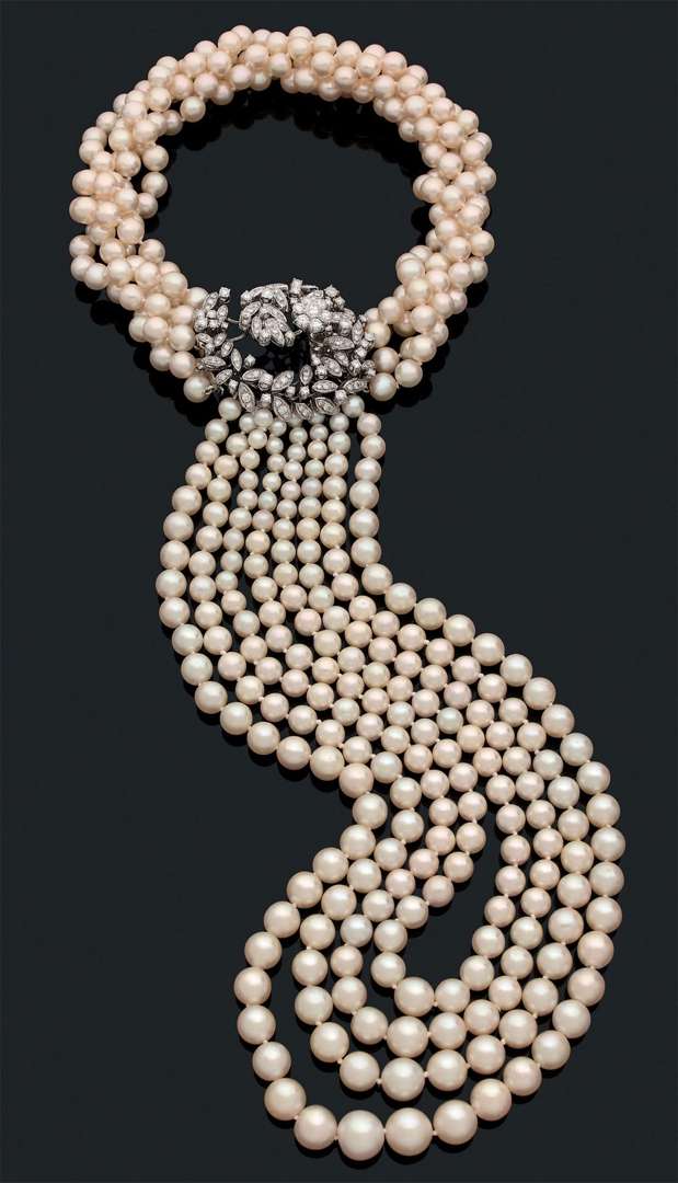 Huit rangs de perles, motif central fleuri, diamants