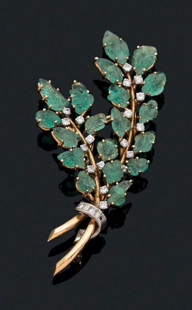 Emeraudes gravées en feuilles, diamants ronds et baguettes