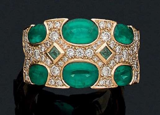 An emerald, diamond and gold ring