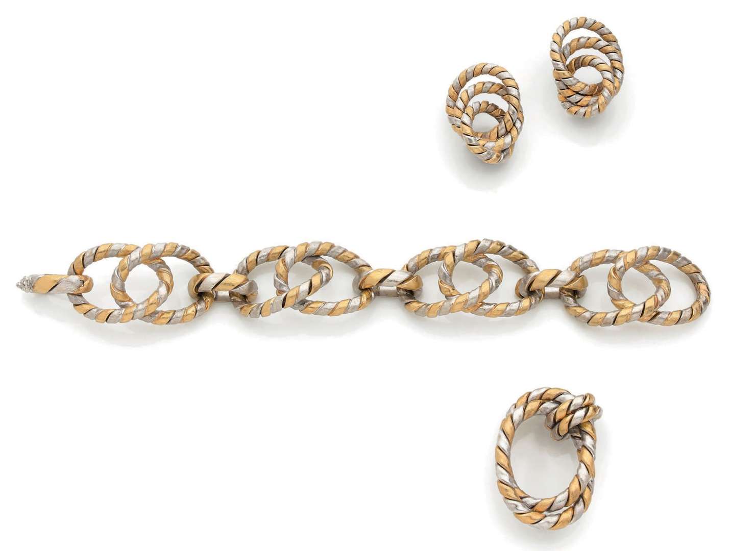 Bracelet, broche et motifs d'oreilles torsadés deux ors 18K (750)