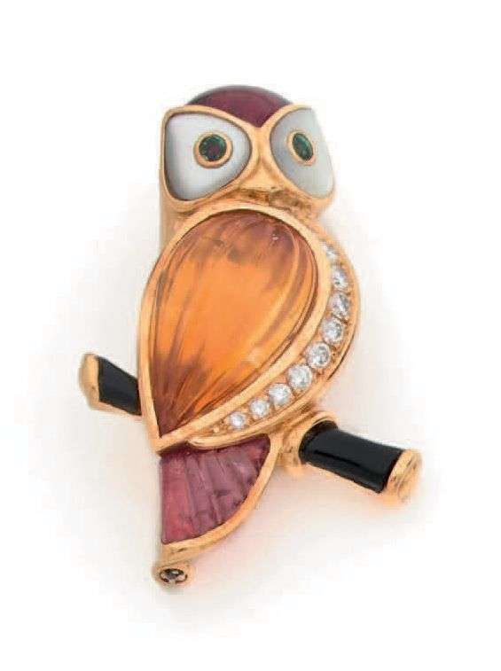 An enamel, emerald, citrine, amethyst, diamond and gold brooch, signed