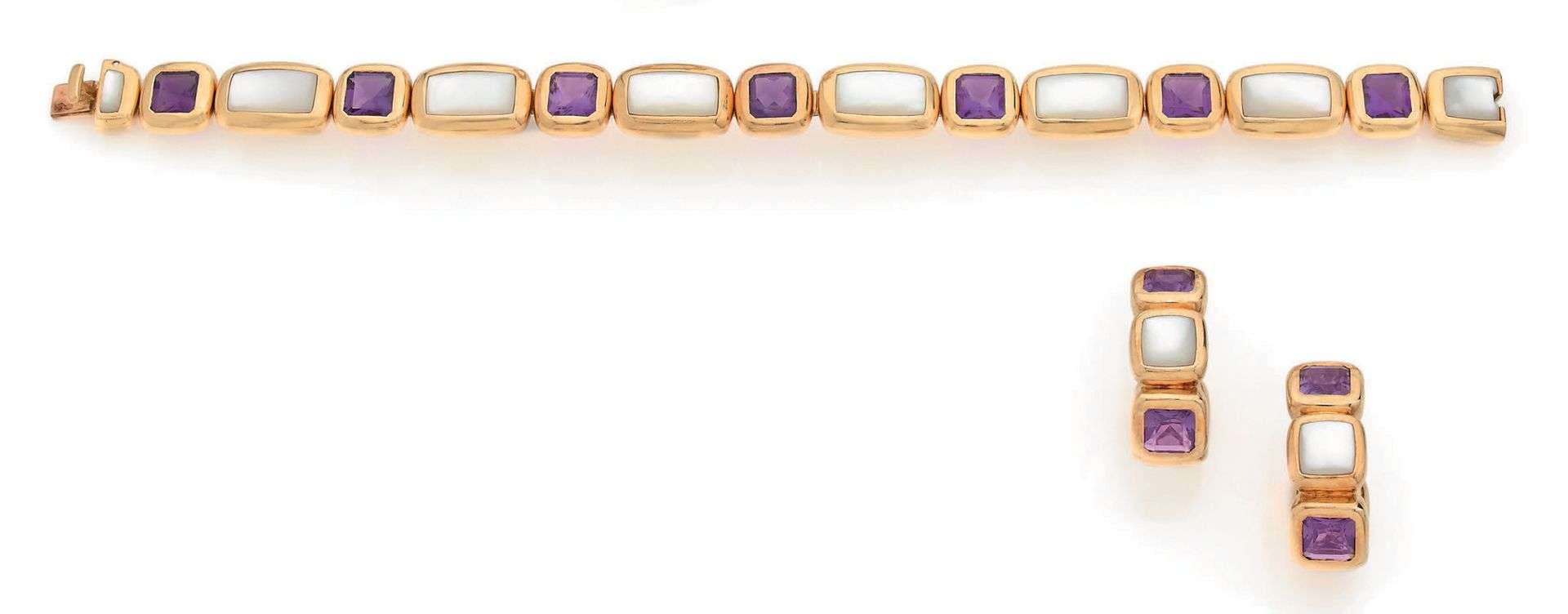 An amethyst, mother-of-pearl and gold earrings and bracelet, signed